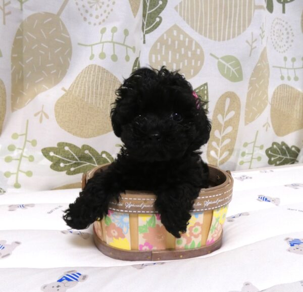メッセージ:106gで生まれた小さな小さな女の子。人口哺育とママの母乳でここまで頑張って育ちました✨今では瞬間移動できるほど高速で走り回ってとっても元気です!ミスカラーなしの綺麗なブラックでマズルも超短く小さいお鼻♡当犬舎初めてのマイクロサイズ予想です!!※頭に小さなペコがありますが成長と共に塞がってきていますのでさほど心配ございません。※お引渡しは成長を見て生後3ヵ月前後を予定しております。大変申し訳ございませんがこの子は極小サイズの為、先住犬がいるお家の場合は先住犬との体格差があまりないご家族を探しておりますのでご了承ください_(._.)_素敵なご縁を心よりお待ちしております♪
